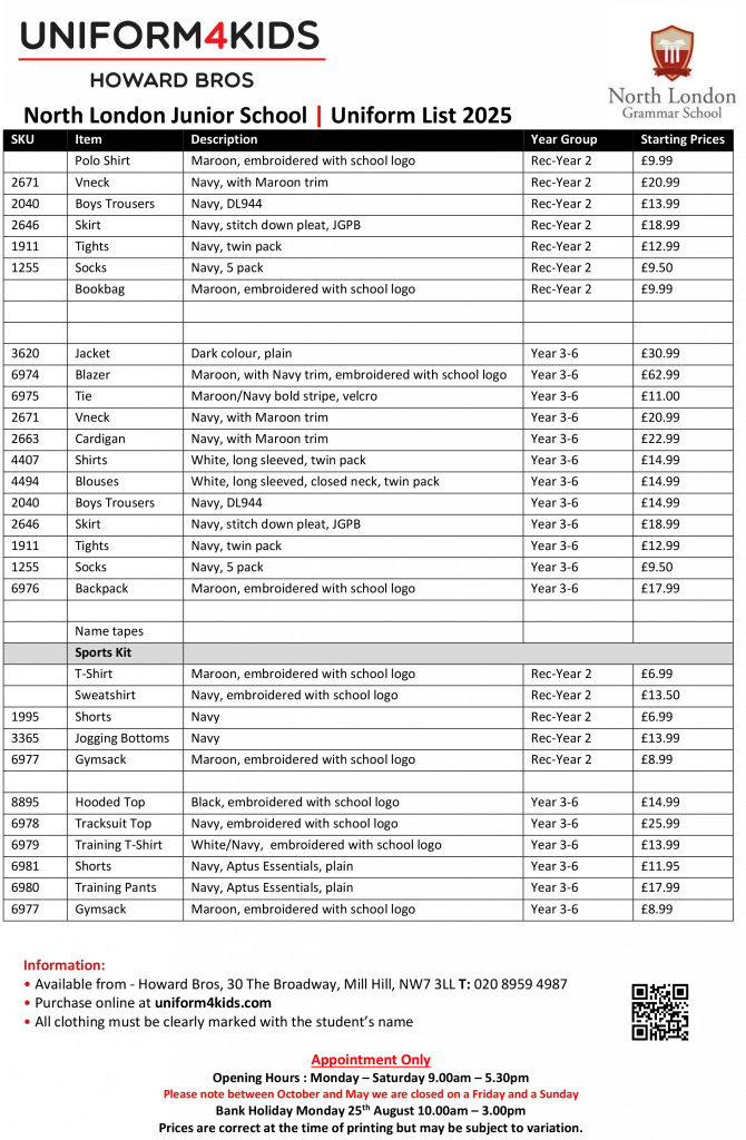 *All uniforms must be bought from the school uniform supplier. (www.uniform4kids.com)